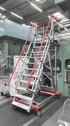 Die Einsatzbereiche von Plattformleitern sind vielfältig und genauso breit gefächert sind die Varianten hinsichtlich der Stufenart, die über das HYMER-Baukastensystem angeboten werden. „Bei den fahrbaren Podesttreppen im Hamburger Werk fiel die Wahl auf Alu-Profilstufen. Aufgrund ihrer Beschaffenheit eignen sie sich besonders für den Einsatz in Produktionshallen und Werkstätten.